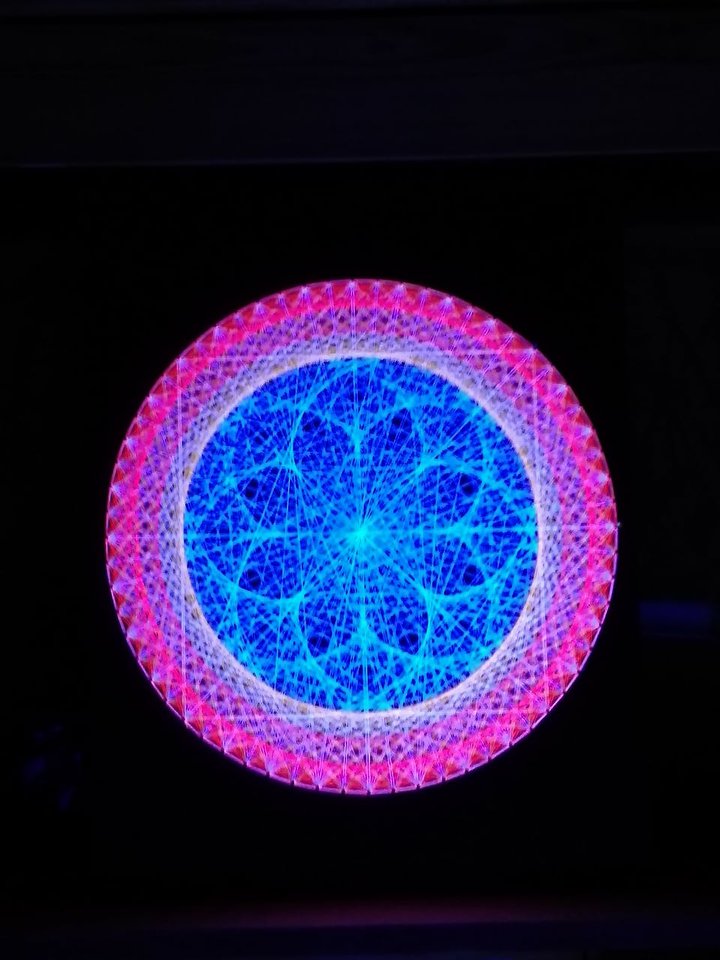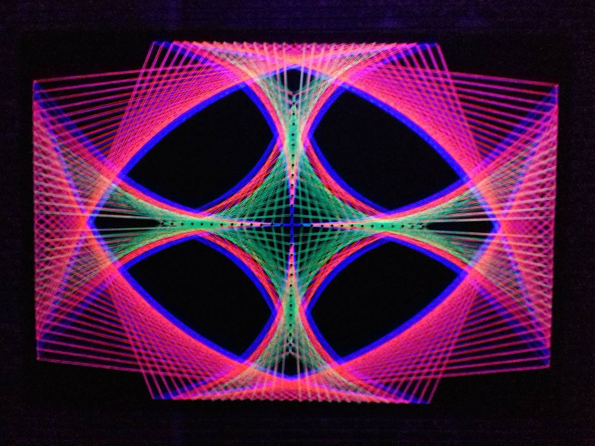 Stiil: geomeetriline stringart, neoonvalguses helendav kunst