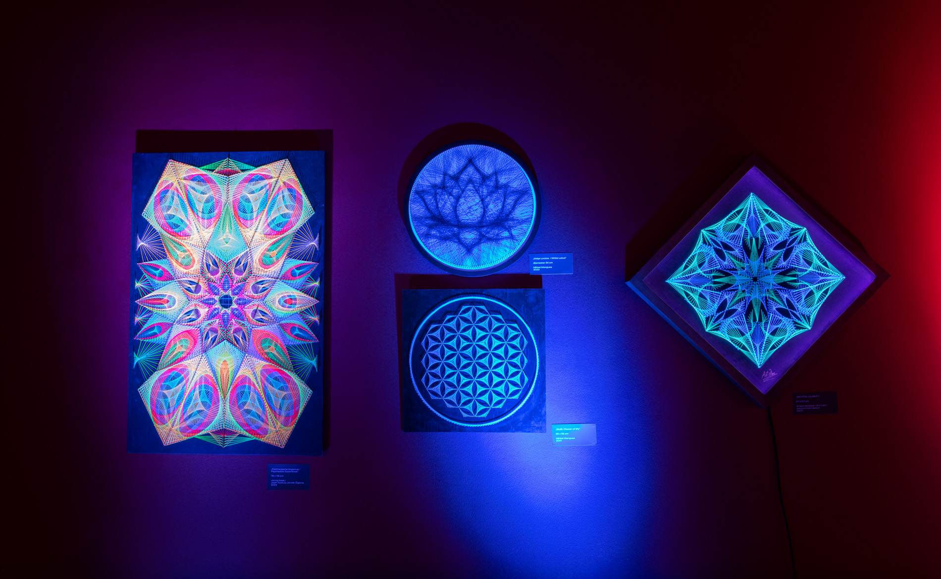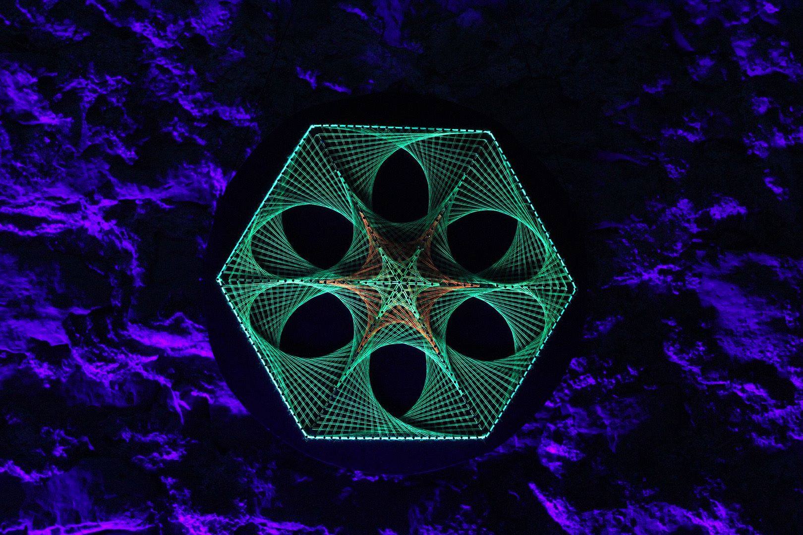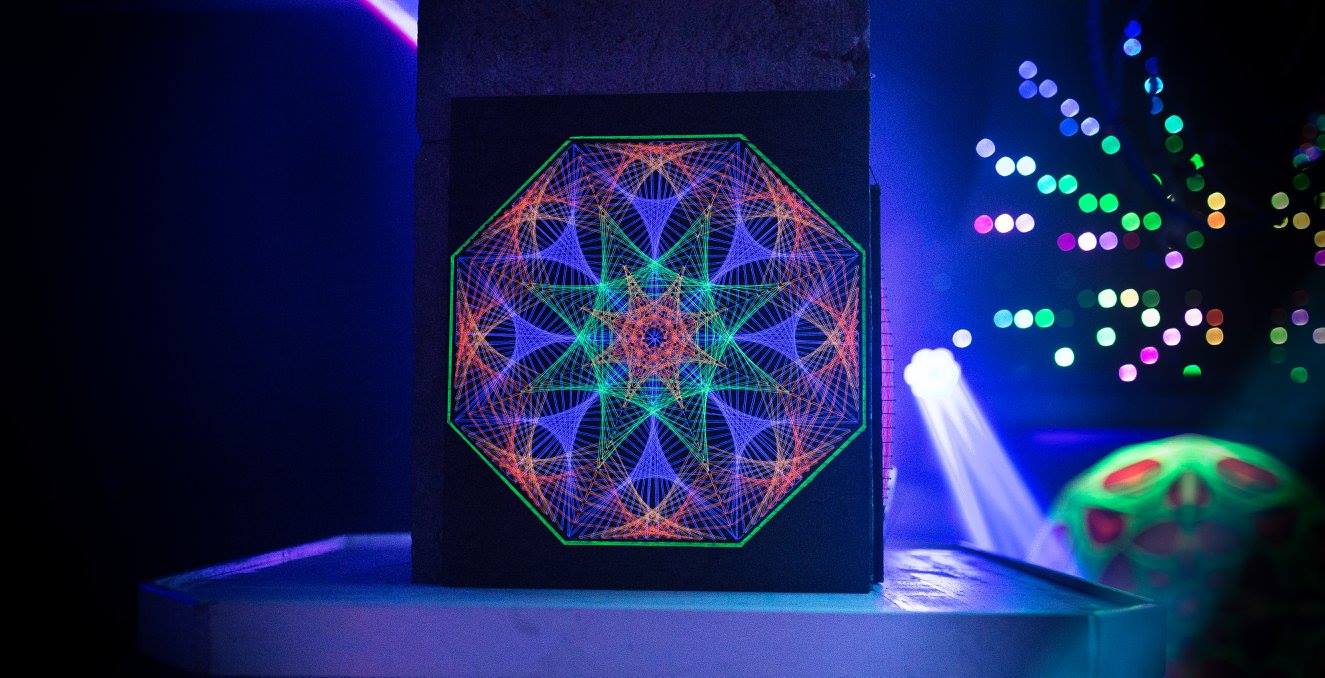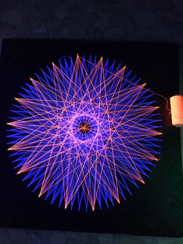 See on meie esimene nöörikunsti pilt, mille raami on paigaldatud tuled. Kaks LED-ide komplekti – UV ja RGB –, mõlemat saab eraldi puldiga juhtida.